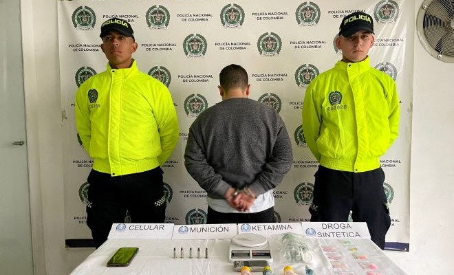De igual manera, en el procedimiento adelantado, fueron incautados dos tarros de Ketamina, diferentes unidades de éxtasis y tusibi, cinco cartuchos, calibre 38, un celular, y dos grameras.