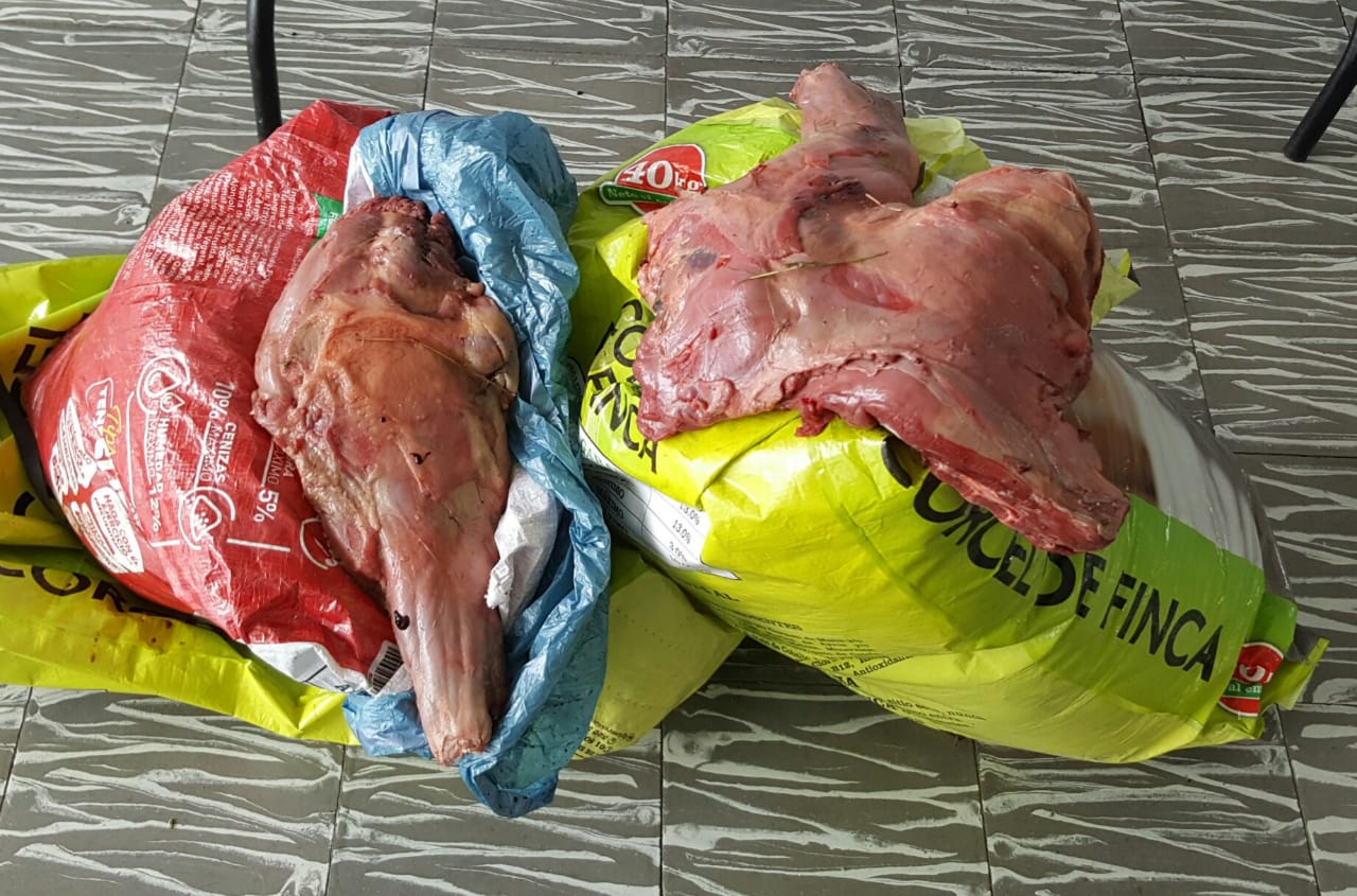 La Policía Nacional en el Departamento de Policía Valle, en el marco del Plan ‘Navidad Segura’- Más cerca del ciudadano, el Grupo de Protección Ambiental y Ecológica, realizó la captura en flagrancia de dos personas, los cuales tenían en su poder cuatro chigüiros muertos y despostados (despresados), con un total de 80 kilos de carne.