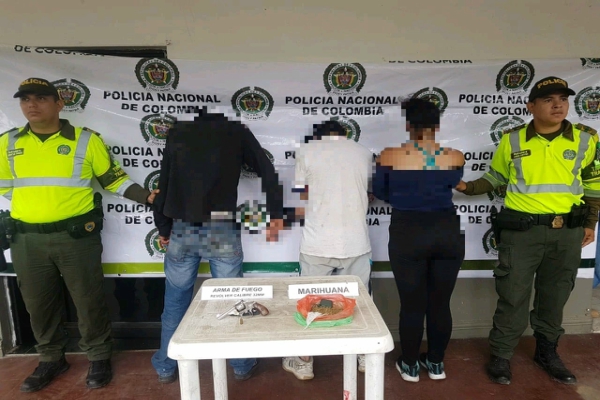 Continuando con los operativos contra la droga y el delito, el departamento de Policía Tolima se permite informar que siendo aproximadamente las 10:30 de la mañana, momentos en que las unidades de la seccional de tránsito y transporte Tolima, realizaban planes y controles frente a la cooperativa del municipio de Saldaña, se logró la captura en flagrancia de dos sujetos de 22 y 25 años, así como una mujer de 20 años, a quienes se le incautó un revolver calibre 38, con la serie borrada y con un cartucho para el mismo, así como 100 gramos equivalentes a cerca 220 dosis de marihuana.