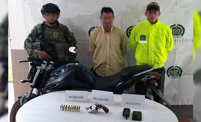 El primer caso, liderado por nuestras unidades de Investigación Criminal, se registró en la vereda Chinata del municipio de Puerto Lleras, con la captura de un hombre de 42 años de edad, a quien se le halló en su poder un revólver marca Llama Scorpion, calibre 38 largo, con 18 cartuchos sin permiso para porte o tenencia. Fue interceptado cuando se movilizaba en una motocicleta.