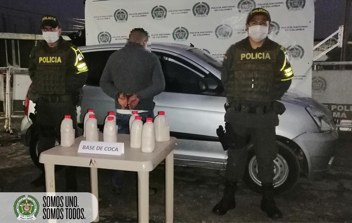 La acción policial se desarrolló en la vía Junín – Pedregal, sector de Piedrancha, municipio de Mallama, allí nuestros uniformados detuvieron un vehículo y procedieron a realizar un registro a su conductor, encontrando al interior del automotor, ocultos dentro del tanque del combustible, 9 tarros plásticos transparentes que en su interior contenían una sustancia que por sus características se asemejaba a la base de cocaína con un peso de 4.500 gramos lista para ser distribuida.