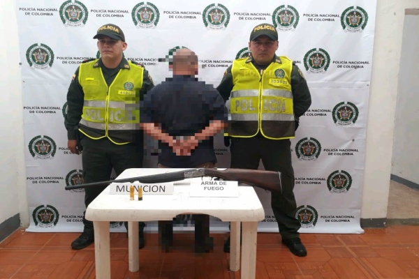 Continuando con el despliegue de la estrategia integral contra los delitos que afectan la vida humana, el departamento de Policía Tolima se permite informar que siendo aproximadamente las 10:05 de la mañana, momentos en que personal del cuadrante realizaba registro y control a personas, en la vereda campeón bajo jurisdicción del municipio de Fresno, se logra la captura en flagrancia de un hombre de 45 años de edad, a quien se le hallo en su poder un arma de fuego tipo escopeta calibre 20 milímetros con dos cartuchos para la misma.