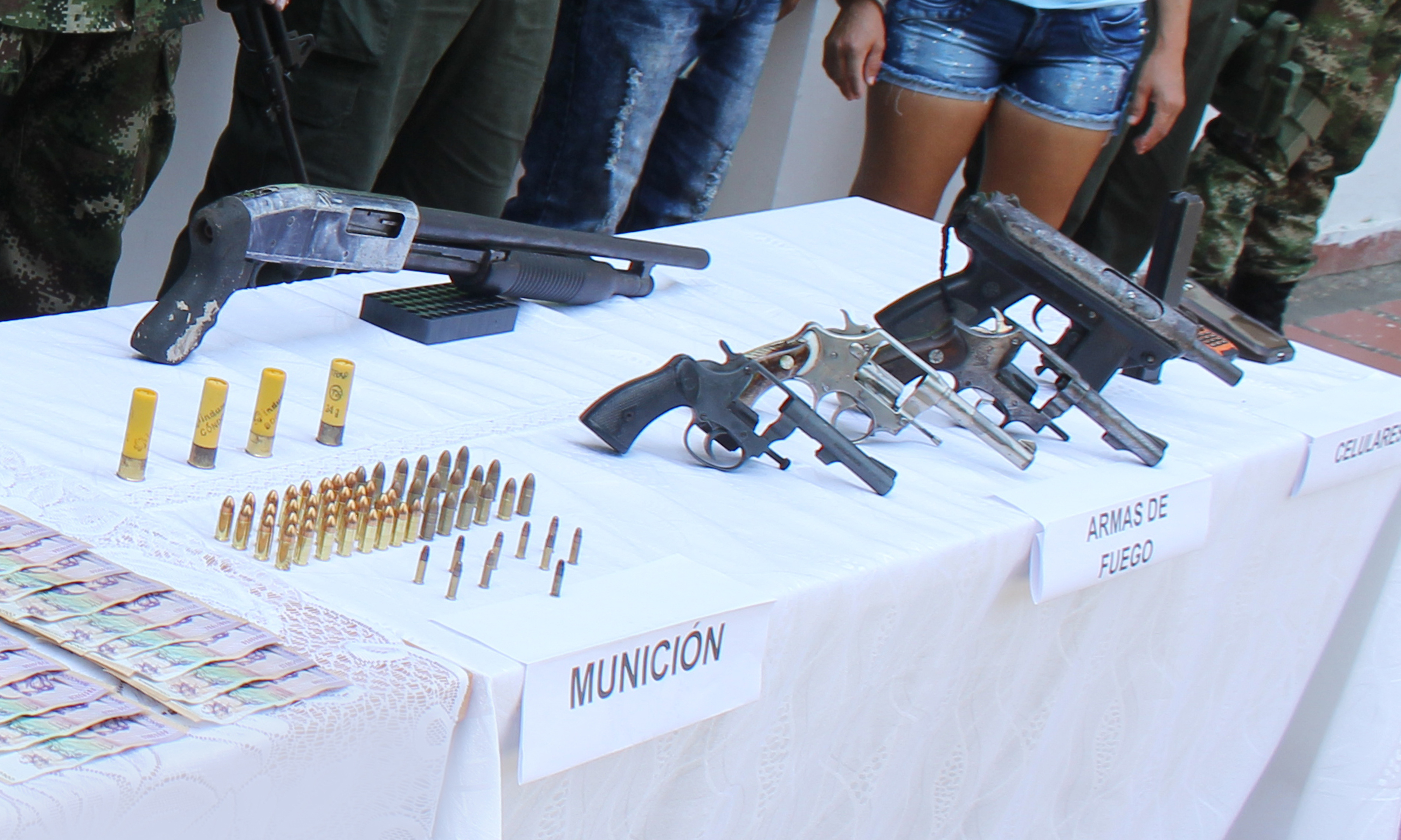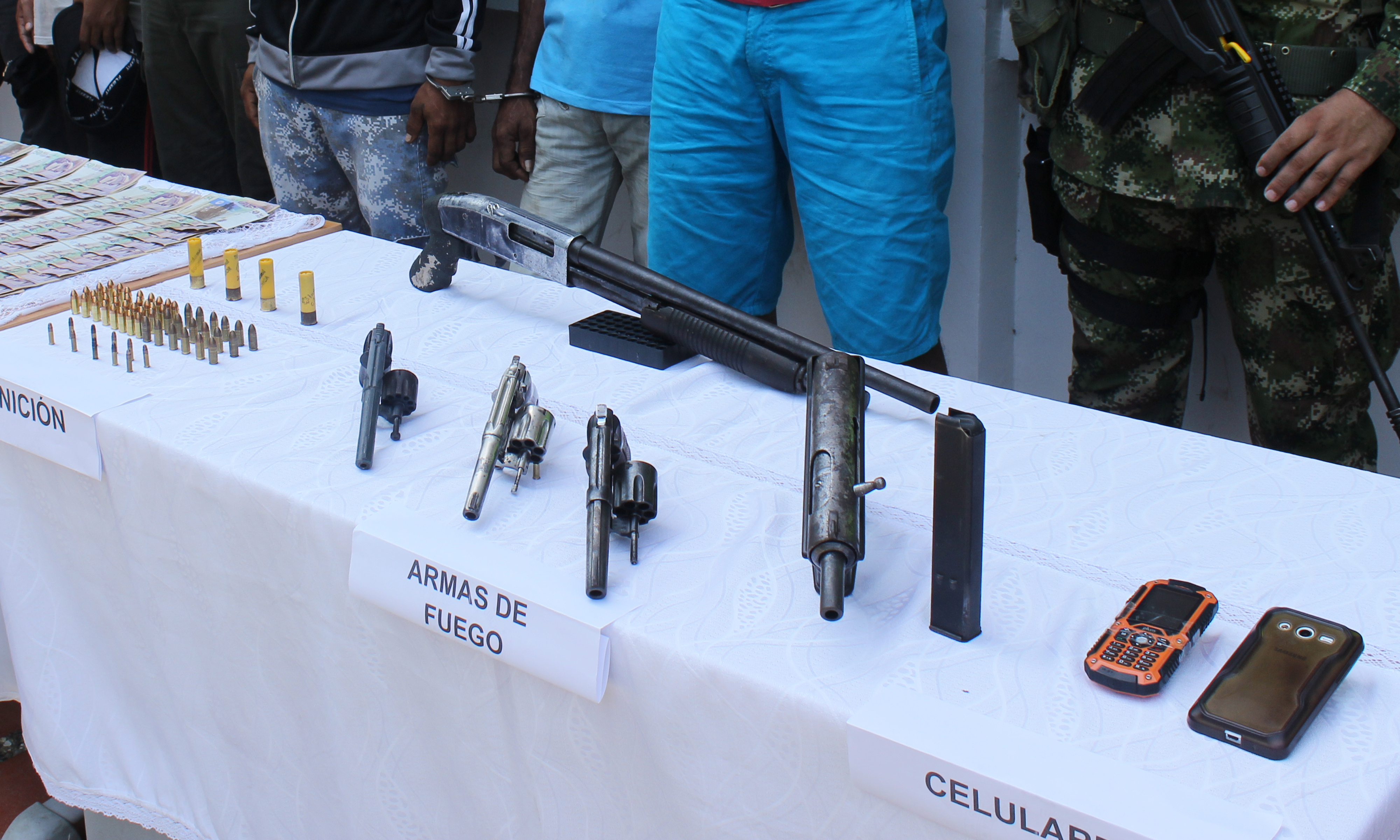 Dentro de los capturados se encuentran dos personas conocidas como “Elio” de 52 años de edad, quien se desempeñaba como logístico y “caree loco” de 23 años de edad, quien se desempeñaba como escolta, es de anotar que estos sujetos hacen parte de la estructura del grupo armado organizado clan del golfo con injerencia en el municipio de Puerto Escondido, además logramos la incautación de una escopeta, dos revolver calibre 38 mm, un revolver calibre 22 mm , una sub ametralladora KG-99, calibre 9mm , un proveedor, 52 cartuchos calibre 9mm, 10 cartuchos calibre 22 mm , cuatro cartuchos calibre 20 mm, dos celulares y la suma de $10.000.000 millones de pesos en efectivo, producto al parecer de la extorsión y el narcotráfico en la zona costera.