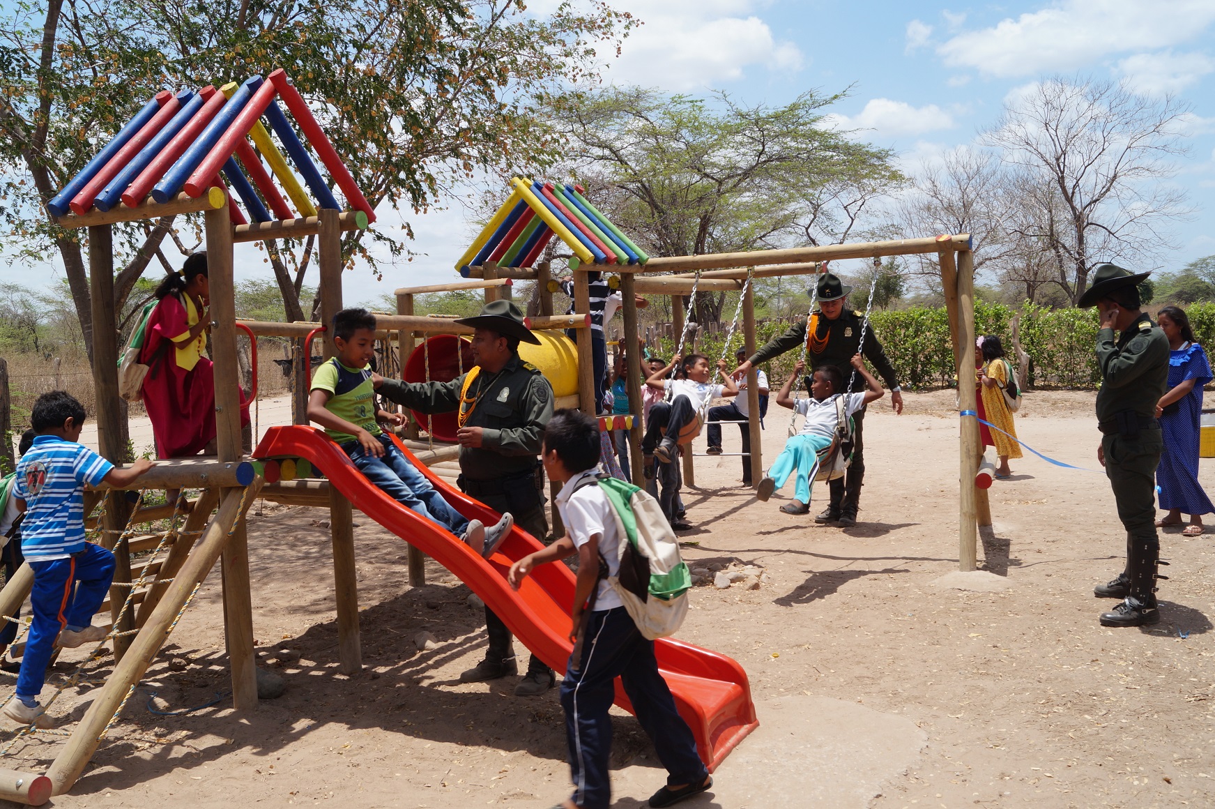 Gracias a la coordinación y gestión entre la Dirección de Carabineros quien pudo lograr la consecución de los elementos, el comando de Departamento de Policía Guajira quien realizó el traslado de estos, desde la ciudad de Bogotá y la Embajada Americana quien fue la que donó el material, es posible hoy la adquisición de un parque infantil para la recreación y esparcimiento de los niños wayuu de esta comunidad, luego de percibir la falta de un espacio digno para el libre desarrollo social, comunicativo y cognoscitivo de la población infantil de esta zona, mediante los diferentes patrullajes e inspecciones rurales realizados periódicamente por parte del Grupo de Carabineros y Guías Caninos.