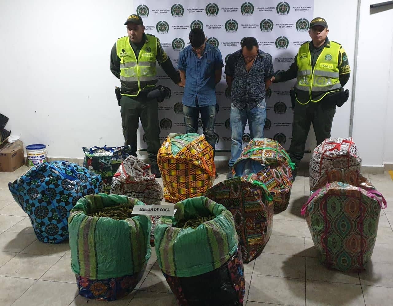 El primer hecho se registró en la vía Andalucía – cerritos- sector San Pedro, mediante registro y control a vehículos, donde gracias a la pericia de los uniformados, se halla un alijo, igualmente se capturan dos personas que se movilizaban en un bus de servicio público, con diez costales con semillas de cocas para un total de 6400 tallos. El vehículo cubría la ruta Pasto – Medellín.