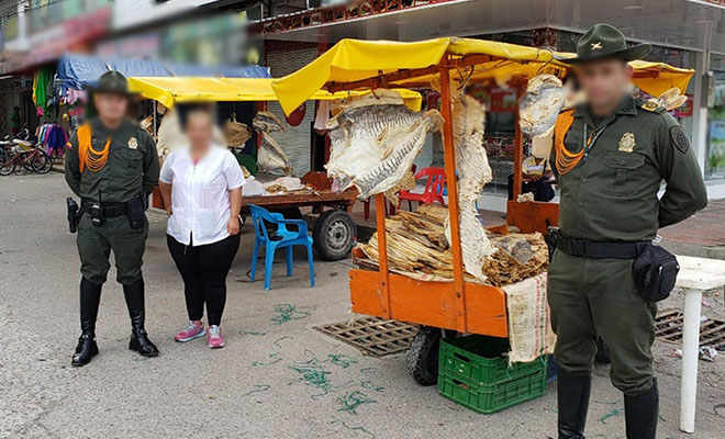 Durante los procedimientos adelantados en el municipio de Fuentedeoro, se realizó la incautación de 177 kilogramos de pescado seco, los cuales eran comercializados por dos mujeres y un hombre de edades 38, 42 y 54 años respectivamente, sin cumplir lo establecido en la Ley 9 de 1979 donde se reglamentan las medidas sanitarias.