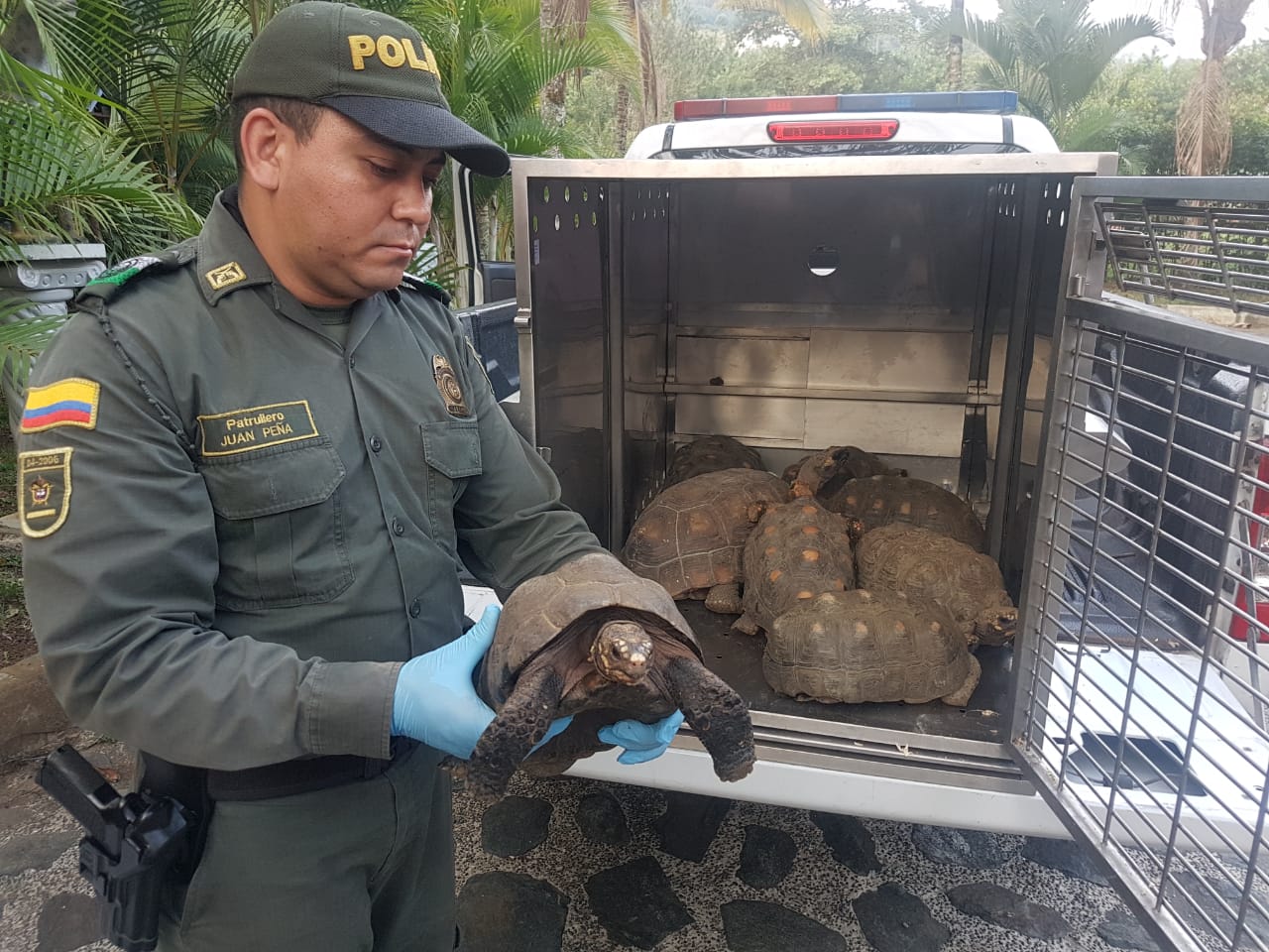 Hasta la vereda Portachuelos llegaron los uniformados donde reciben de manos de un ciudadano un total de 11 especies (8 tortugas Morrocoy, 2 tortugas Hicoteas y una guacamaya azul y amarilla), las cuales fueron entregadas de manera voluntaria, luego de se recibiera una denuncia sobre este caso de tenencia ilegal de estas especies en la zona.