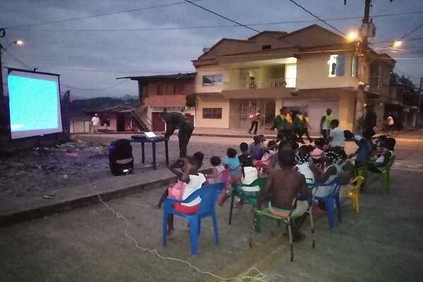Implementación del programa “Cine con tu Policía” con lo que pretende abarcar la mayor parte de los niños y niñas de Bagadó, para ello visita los diferentes barrios del municipio, llevando mensajes de tolerancia, respeto y solidaridad a través de la proyección de películas educativas